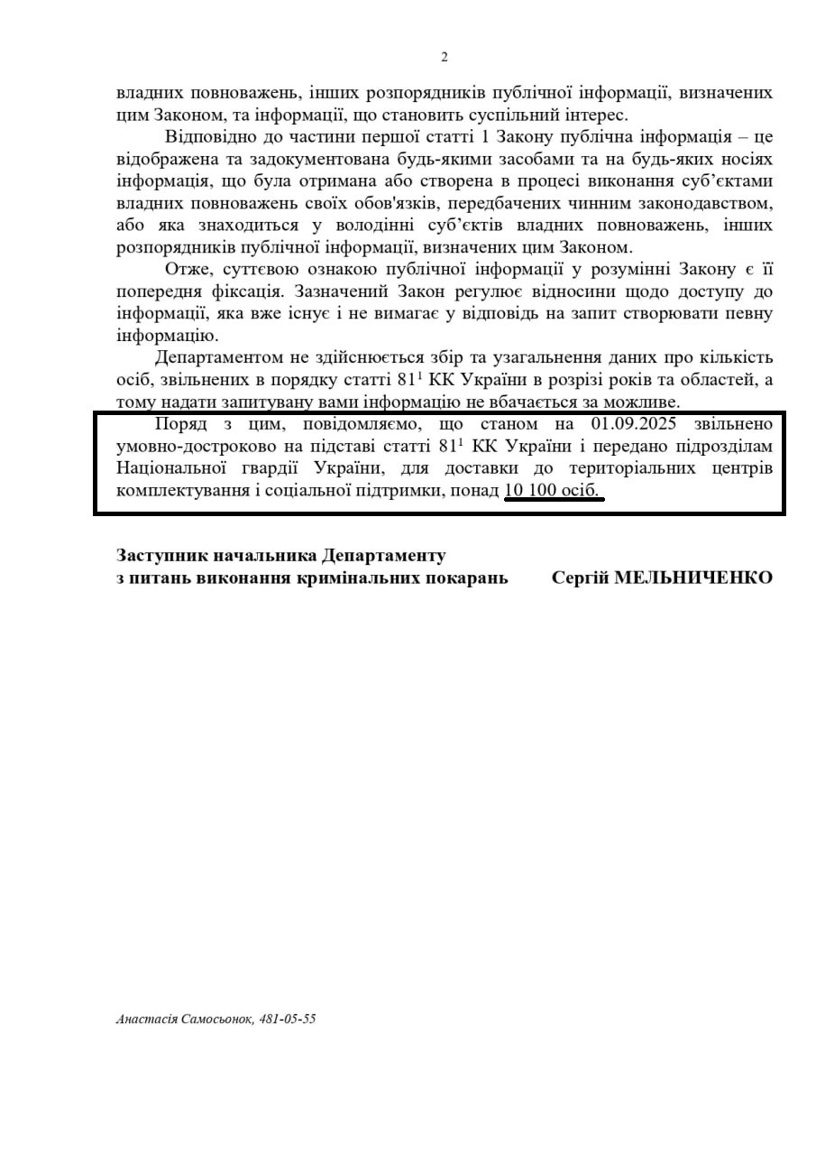 Отмечается, что по состоянию на 1 сентября 2025 года уволено досрочно на основании статьи 811 УК Украины и передано подразделениям Национальной гвардии Украины, для доставки в территориальные центры комплектования и социальной поддержки, более 10 100 человек.