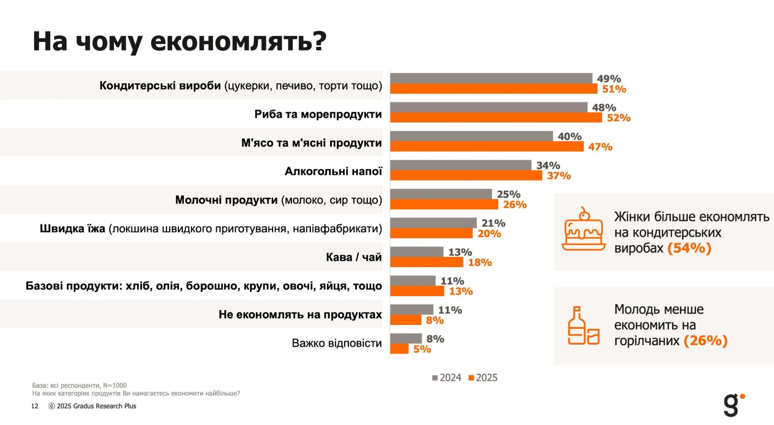Женщины больше экономят на кондитерских изделиях, а мужчины - на алкоголе. Также более 50% украинцев экономят на рыбе и морепродуктах, конфетах, печенье. 26% граждан экономят на молочных продуктах.