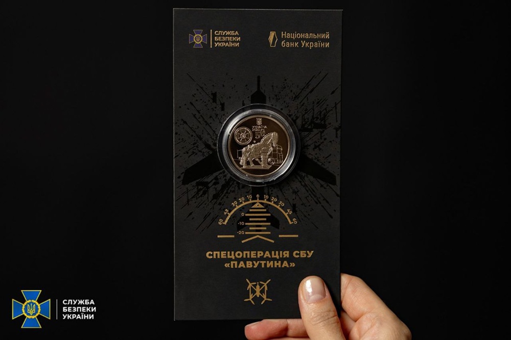 Служба безопасности Украины совместно с Национальным банком представили памятную монету номиналом 5 гривен в честь спецоперации "Паутина". Монета выпущена тиражом 75 тысяч экземпляров в сувенирной упаковке.