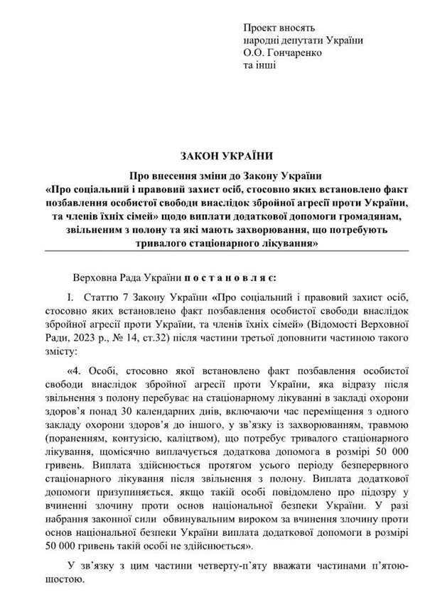 В парламенте зарегистрирован законопроект, предусматривающий ежемесячную выплату 50 тысяч гривен гражданским, освобожденным из плена, для покрытия расходов на лечение. Инициаторы предложения объясняют, что сейчас такая поддержка оказывается только военным, нуждающимся в длительном стационарном лечении после возвращения из плена.