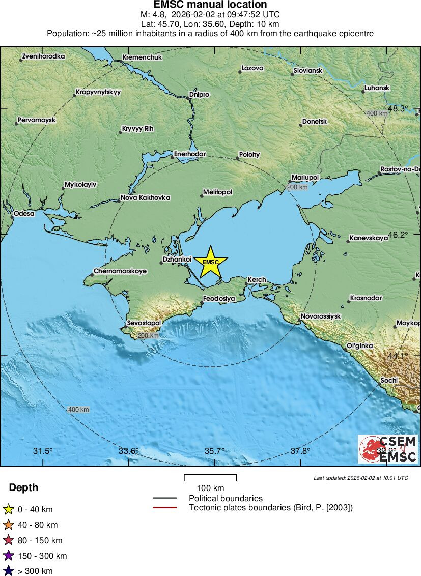 По данным EMSC, в Крыму зафиксировано землетрясение магнитудой 4,8 балла. Толчки произошли в 11:47 по киевскому времени.
