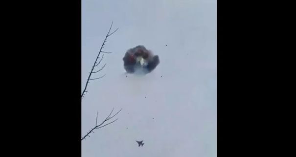 На опубликованных кадрах видно, как дрон летит в небе, а через мгновение взрывается огненным шаром. Рядом пролетает украинский истребитель, а вместо дрона остаются только клубы черного дыма и падающие на землю обломки.