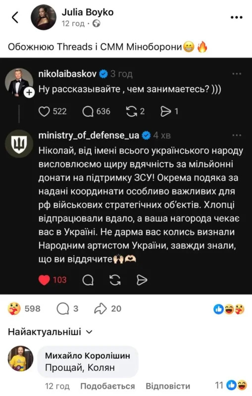 Минобороны Украины "тролит" Баскова в Threads: благодарят за миллионные "донаты"