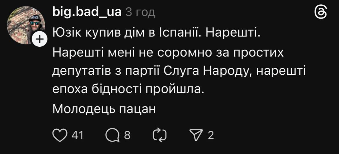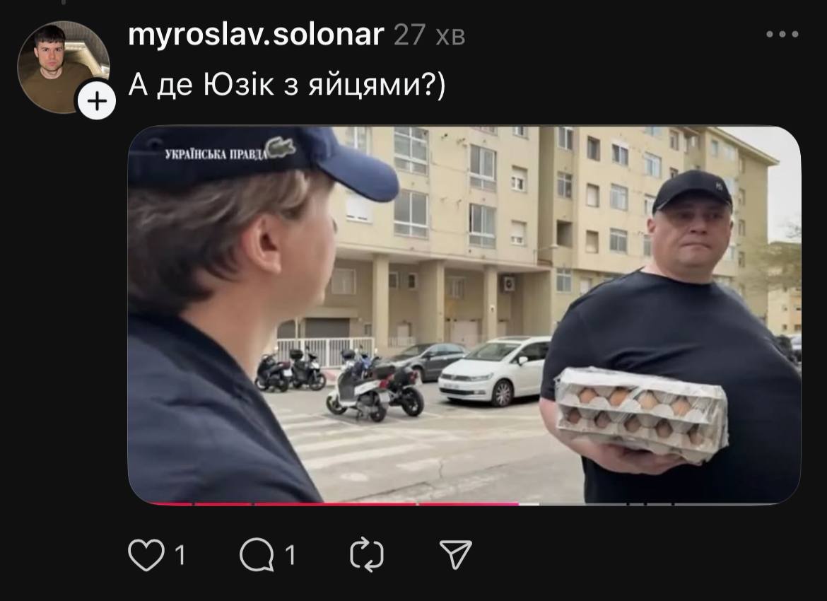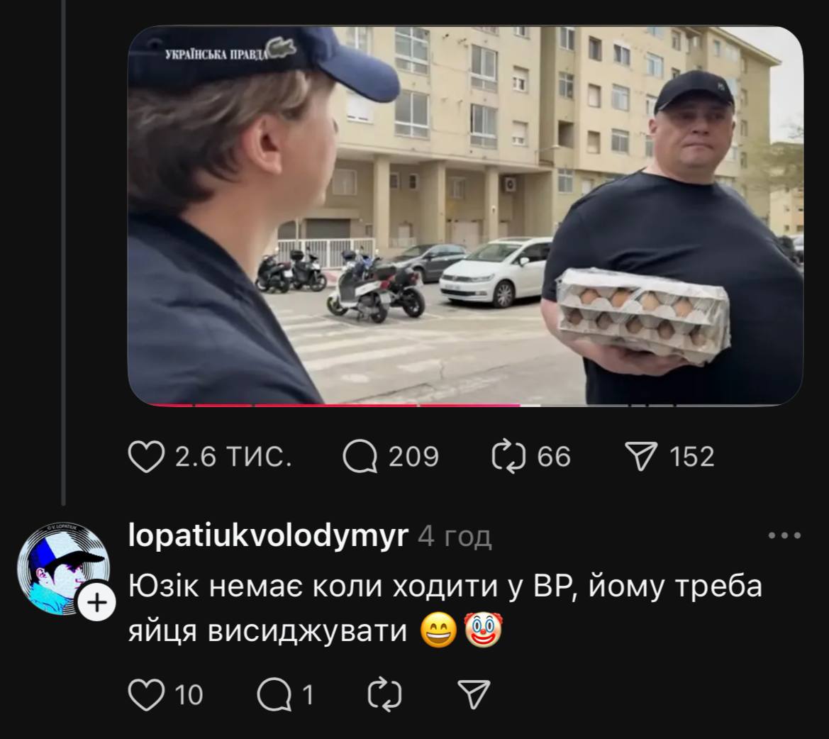 После видео журналиста "Украинской правды" Михаила Ткача, нашедшего депутата Юрия ("Юзика") Корявченкова в Испании, украинцы начали активно реагировать на эту находку в соцсетях. Некоторые пользователи даже похвалили депутата. Мол, не убежал от журналиста, потому что "имеет яйца":