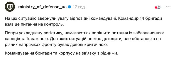 В Министерстве обороны Украины подтвердили, что ситуация находится на контроле руководства, а также принимаются меры по улучшению обеспечения подразделения и возможной ротации военнослужащих.