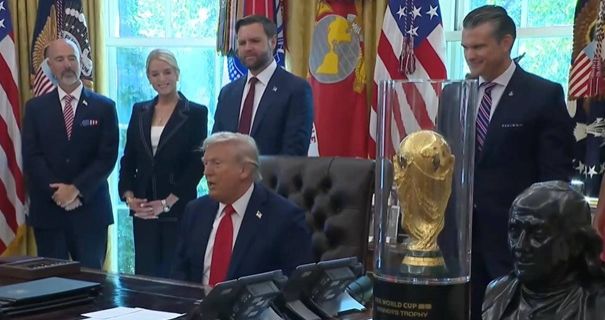 В США в Белом доме произошло необычное событие, связанное с главным футбольным трофеем планеты. Президент Дональд Трамп во время встречи с президентом FIFA Джанни Инфантино обратил внимание на Кубок мира и отметил, что было бы хорошо, оставить его в Овальном кабинете.