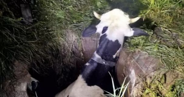 Оказалось, что корова наступила на старый шифер, которым был покрыт септик, и провалилась внутрь. Спасатели совместно с крестьянами с помощью трактора осторожно вытащили животное на поверхность.