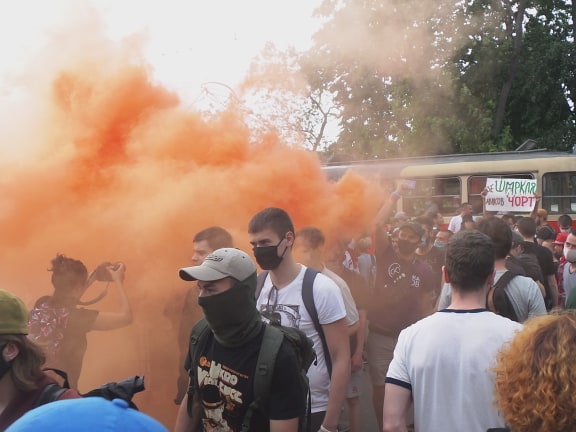 На проїжджій частині більше сотні людей, вони запалили димові шашки, з автомобіля голосно грає музика.