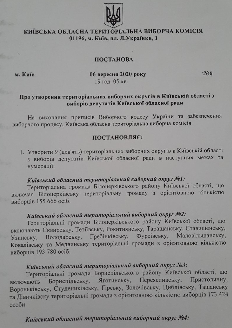 Обговорення відповідного рішення комісія розпочала напередодні, однак, тоді ТВК не змогла ухвалити рішення, оскільки не мала достатньої кількості голосів членів комісії за один із 4 можливих варіантів поділу округів”, - йдеться в повідомленні.