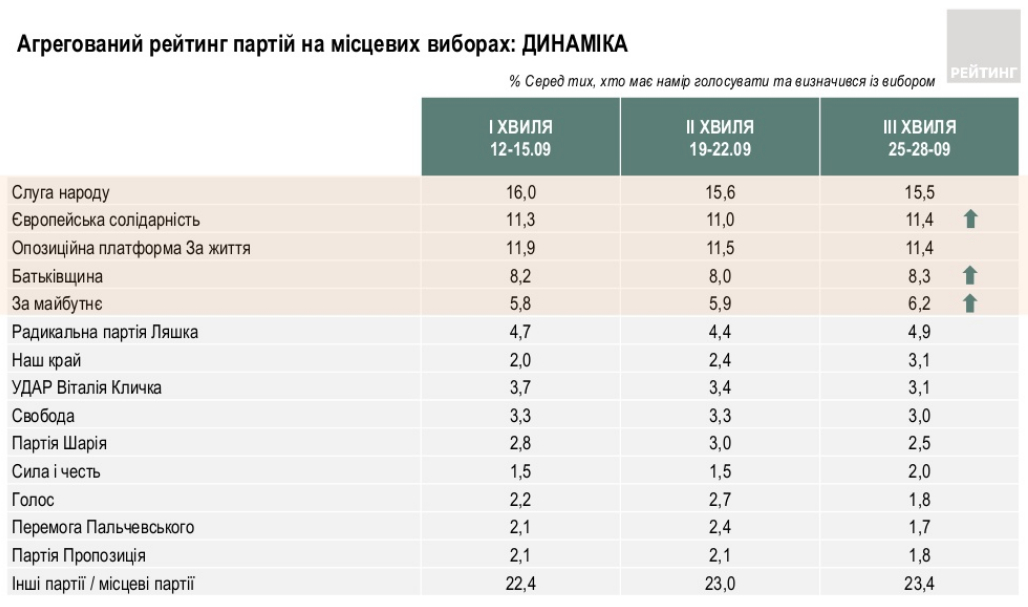 "Європейська солідарність” змогла б отримати 11,4% голосів, "Опозиційна платформа – За життя” – 11,4%, "Батьківщина” – 8,3% і партія "За майбутнє” – 6,2%.