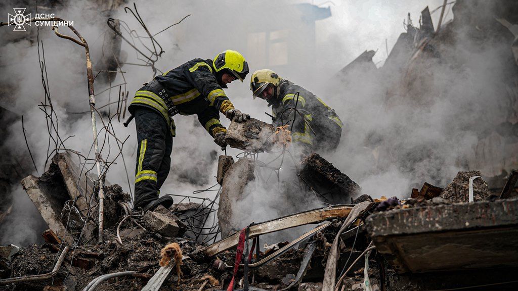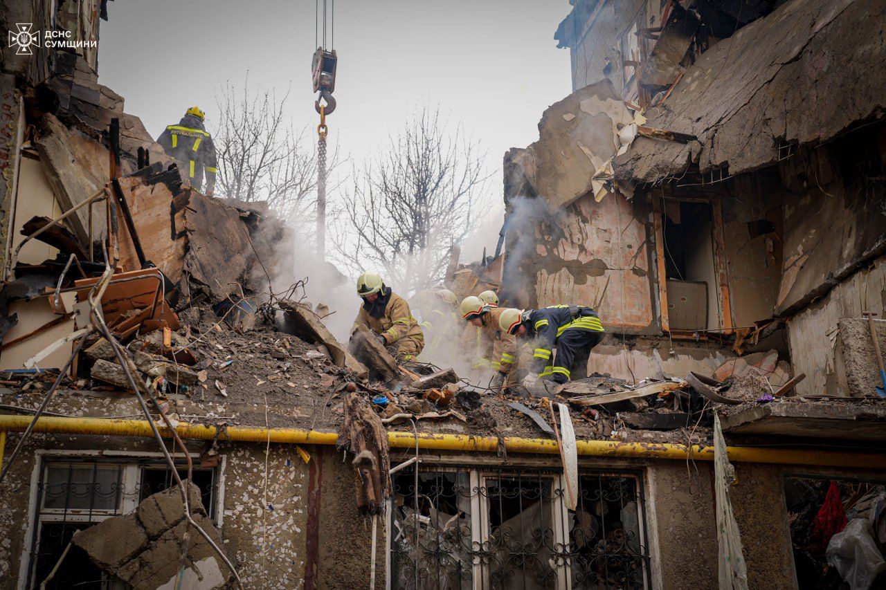 "Впродовж чотирьох днів працюючи в Сумах на місці ворожого удару, рятувальники провели колосальну роботу. В перші години фахівці ДСНС врятували 10 мешканців зруйнованої багатоповерхівки, з яких п’ятьох деблокували з-під завалів. Також з-під завалів було деблоковано тіла трьох загиблих людей”, – йдеться у повідомленні.