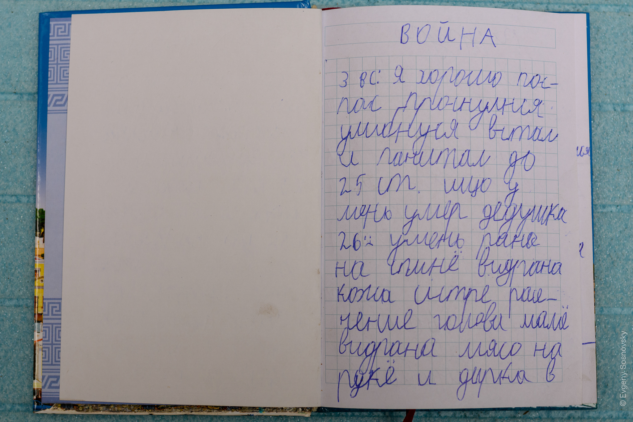 Спочатку чоловік із дружиною та її матір'ю, яка не могла самостійно пересуватися, жили в квартирі багатоповерхового будинку на першому поверсі. Однак незабаром сім'я прихистила родичку Олену Кравцову з 8-річним сином Єгором та 15-річною дочкою Веронікою – всі вони були серйозно поранені. Найбільше страждав хлопчик, і щоб відвернути його увагу від болю, Євген запропонував йому писати щоденник. В майбутньому співачка Тіна Кароль передала щоденник Єгора у Ватикан Папі Римському.