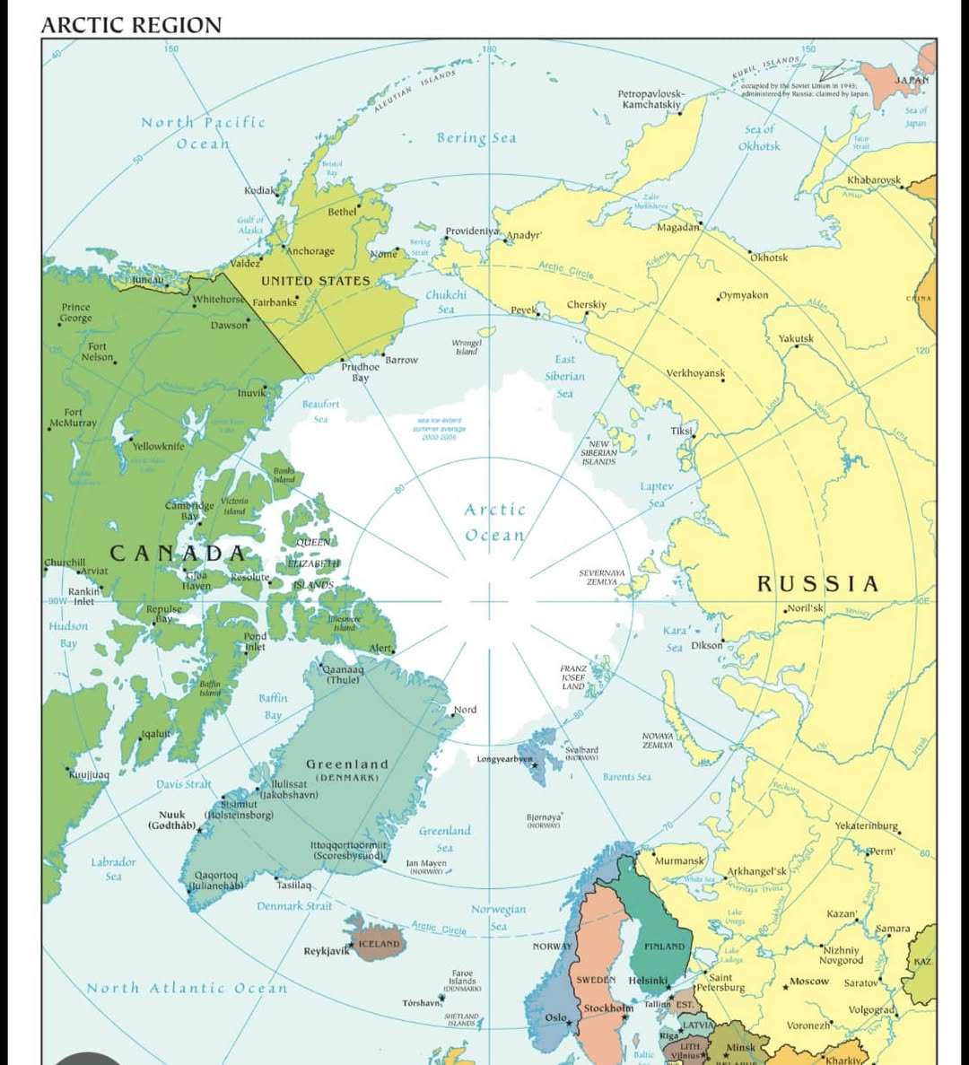 Справа в тому, що відповідно до міжнародного права, доступ на розробку ресурсів Арктики мають країни, що межують з Арктикою сушею. От власне вони всі і на карті.