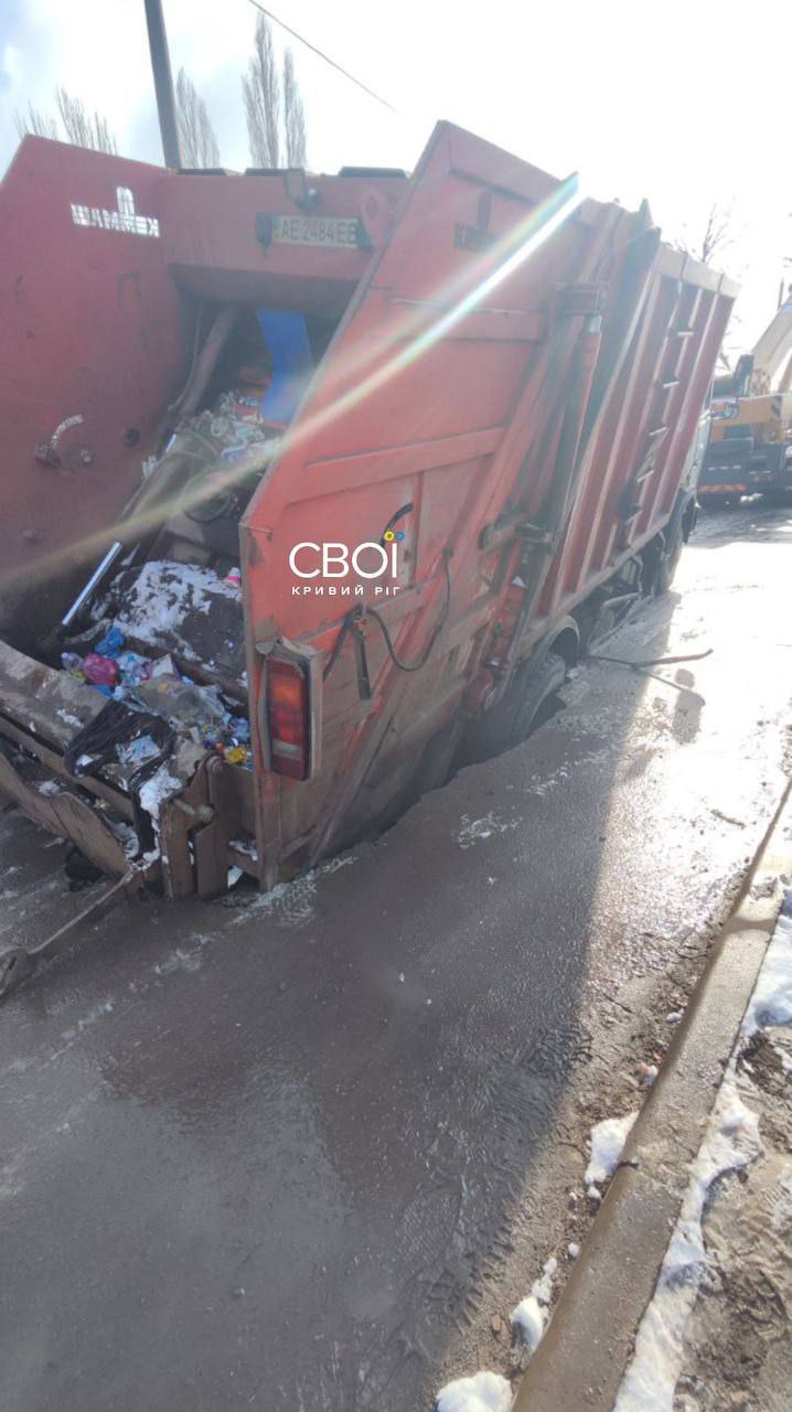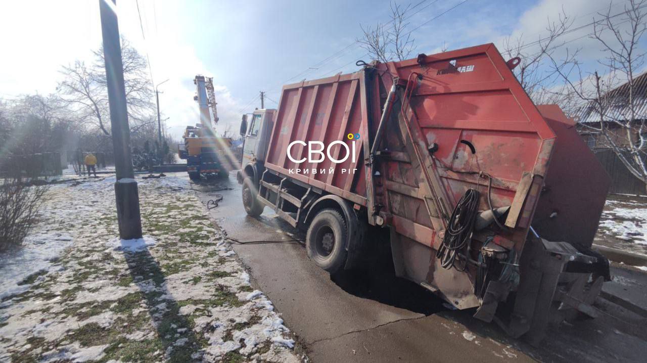 Cміттєвоз провалився у дірку в асфальті у Кривому Розі. На допомогу викликали крановиків