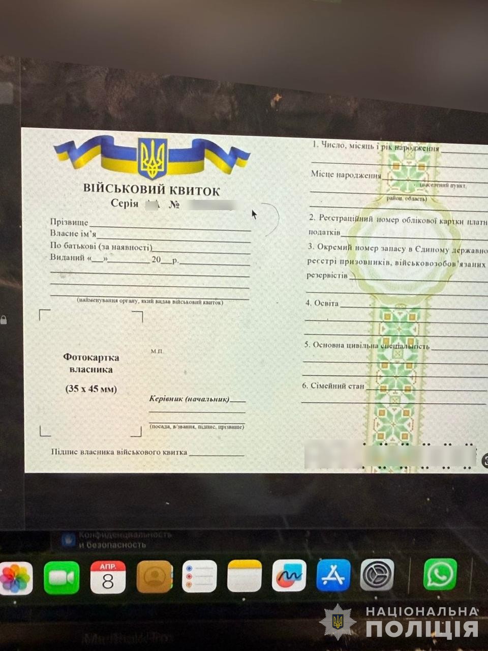 Під час обшуку вдома у 27-річного чоловіка поліцейські вилучили гроші, печатки, носії інформації, ноутбук, копії військово-облікових документів, фото чоловіків, посвідчення.