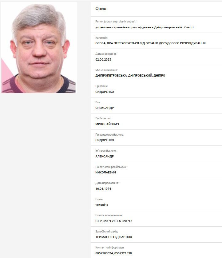 Матеріали передані до ГУНП у Дніпропетровській області. Сидоренку заочно вручено підозру.