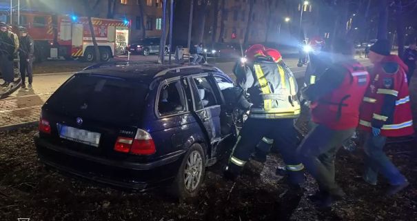 На вулиці Хмельницького автомобіль BMW врізався в бетонну опору, внаслідок чого пасажирку затисло в салоні. Водій зміг самостійно вийти з машини до приїзду рятувальників.