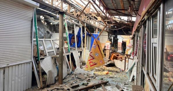 Внаслідок атаки понівечені торгівельні павільйони та магазин. Виникла пожежа.