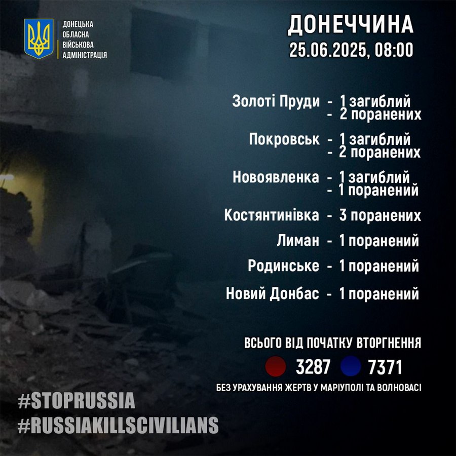 Вчора, 24 червня, окупаційна російська армія вбила трьох мешканців Донецької області. Також 11 цивільних зазнали поранень