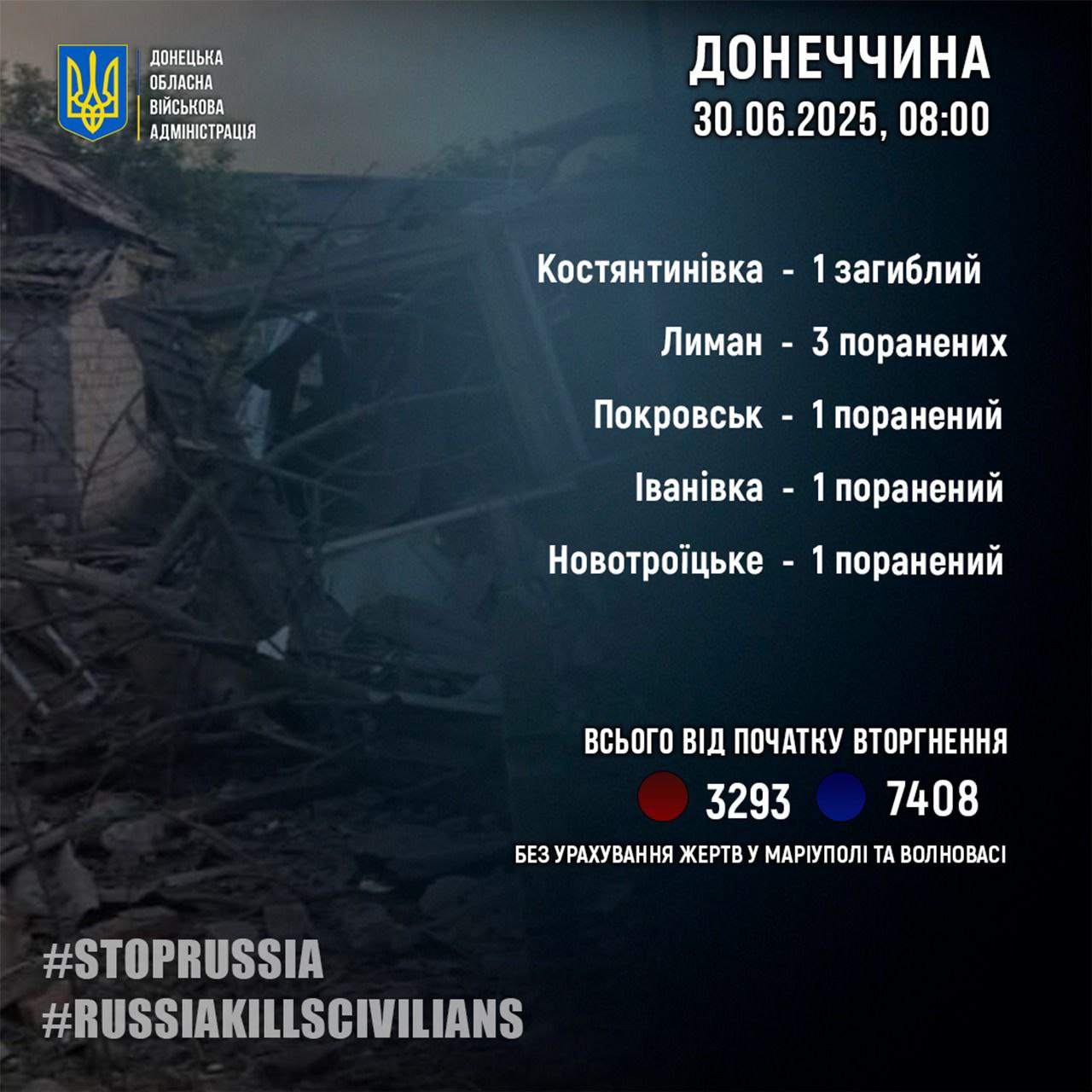 Загальна кількість жертв РФ на Донеччині (3 293 загиблих і 7 408 постраждалих) подана без урахування Маріуполя та Волновахи.