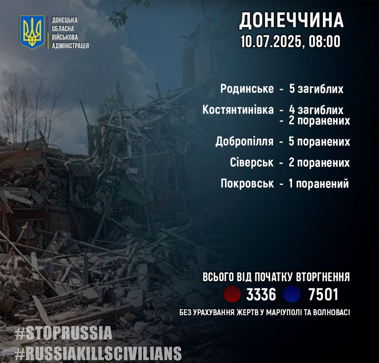 За минулу добу російська армія вбила дев'ятьох мирних мешканців Донецької області. Також 10 цивільних зазнали поранень