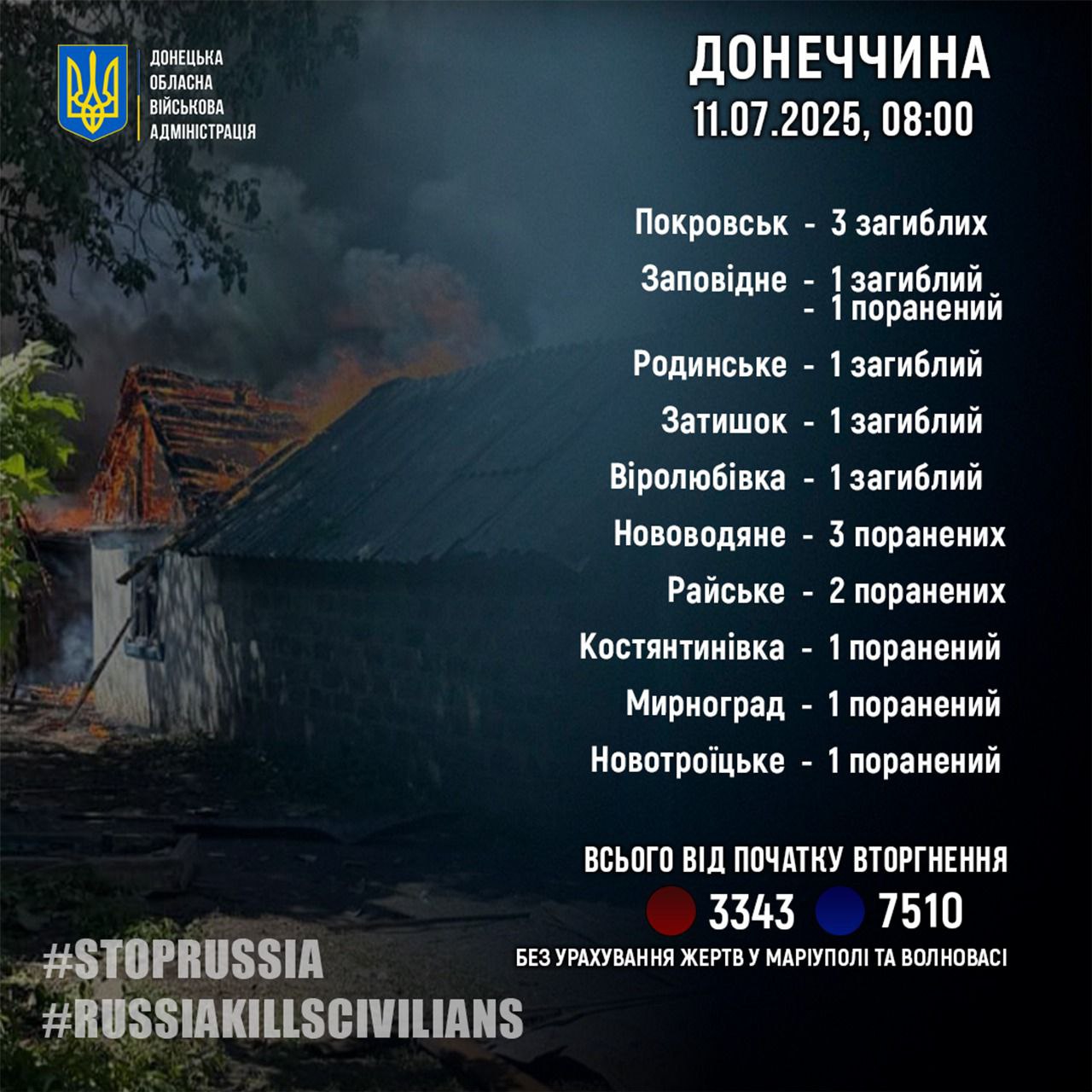 Минулої доби, 10 липня, окупаційна російська армія вбила сімох мирних мешканців Донецької області. Поранення дістали дев'ятеро цивільних