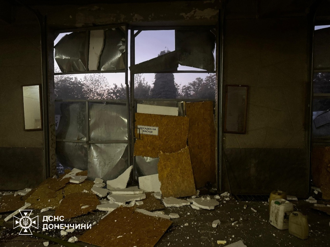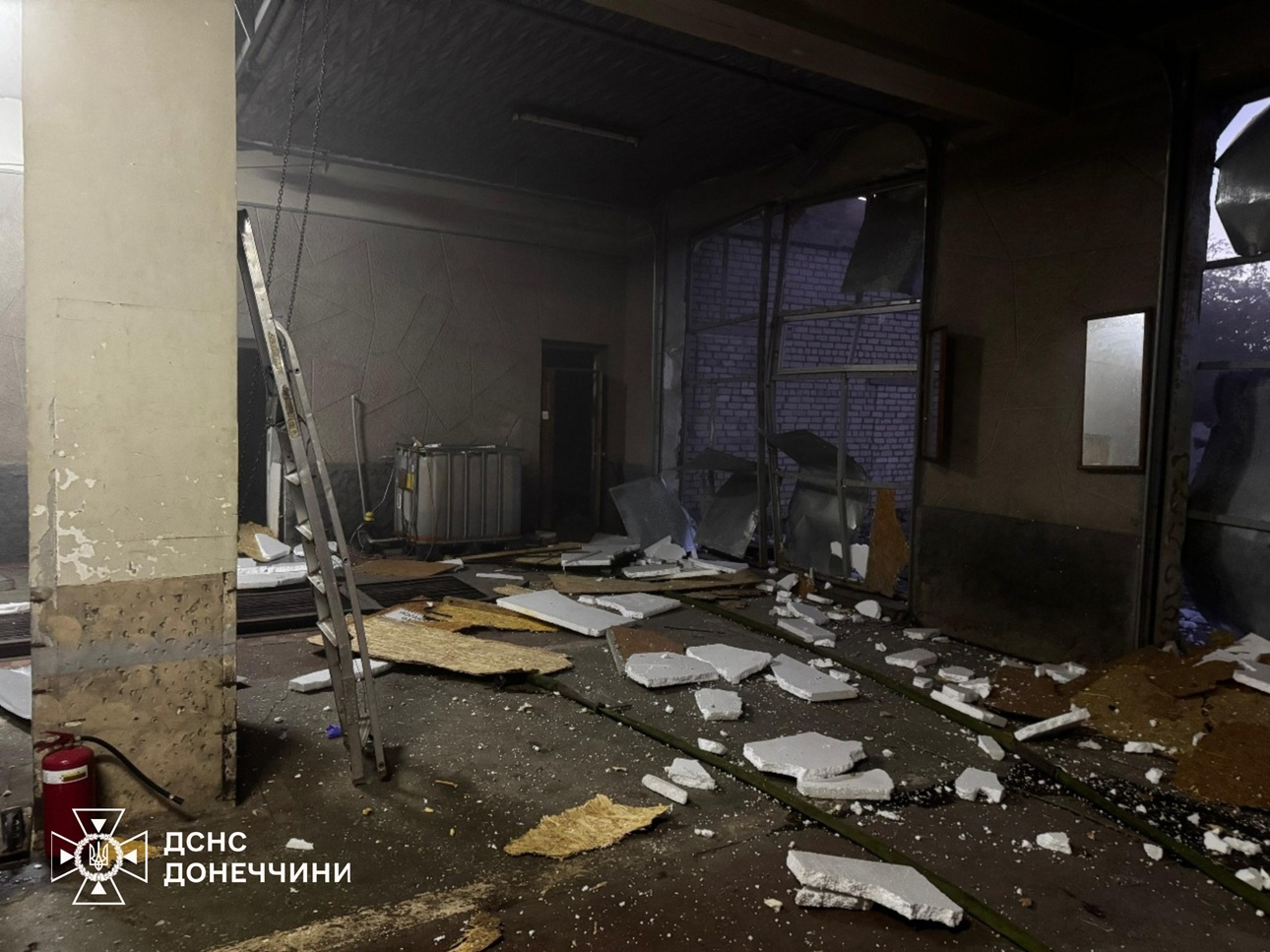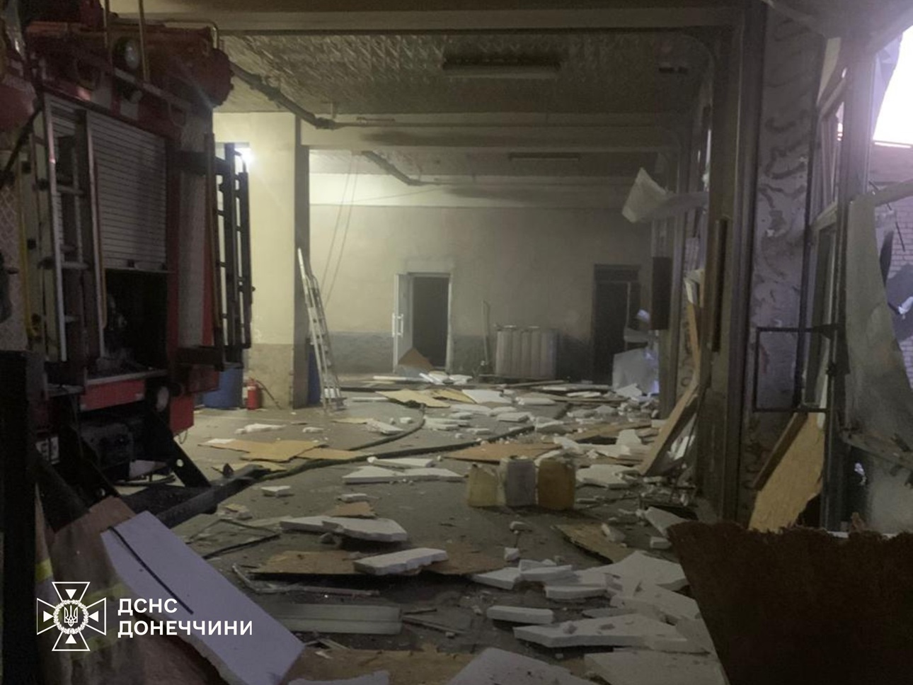 Внаслідок вибухової хвилі постраждала інфраструктура: пошкоджено ворота гаража, дах будівлі, вибито вікна, зруйновано захисні плити на вікнах та пошкоджено двері.