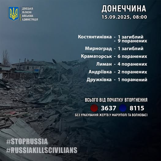 Російські війська за минулу добу, 14 вересня, позбавили життя двох мешканців Донецької області, а ще 20 осіб отримали поранення