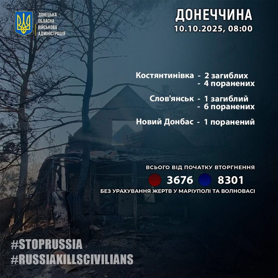 Впродовж 9 жовтня внаслідок ворожих атак на Донеччині загинули троє мирних мешканців