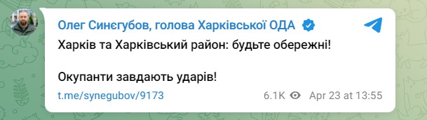 "Харків та Харківський район: будьте обережні! Окупанти завдають ударів!", – повідомив очільник Харківської ОВА.