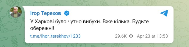 "У Харкові було чутно вибухи. Вже кілька. Будьте обережні!”, – йдеться у повідомленні