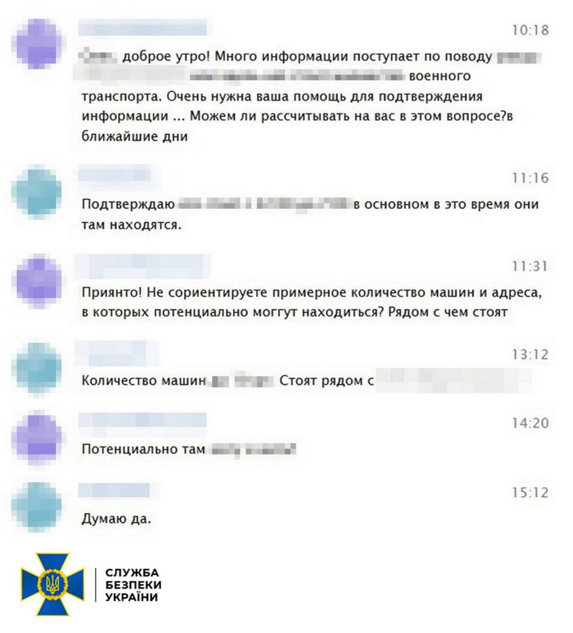 Отримані відомості інформатор месенджером направляв своєму російському куратору у вигляді текстових повідомлень та скріншотів гугл-карт із позначками потенційних цілей.