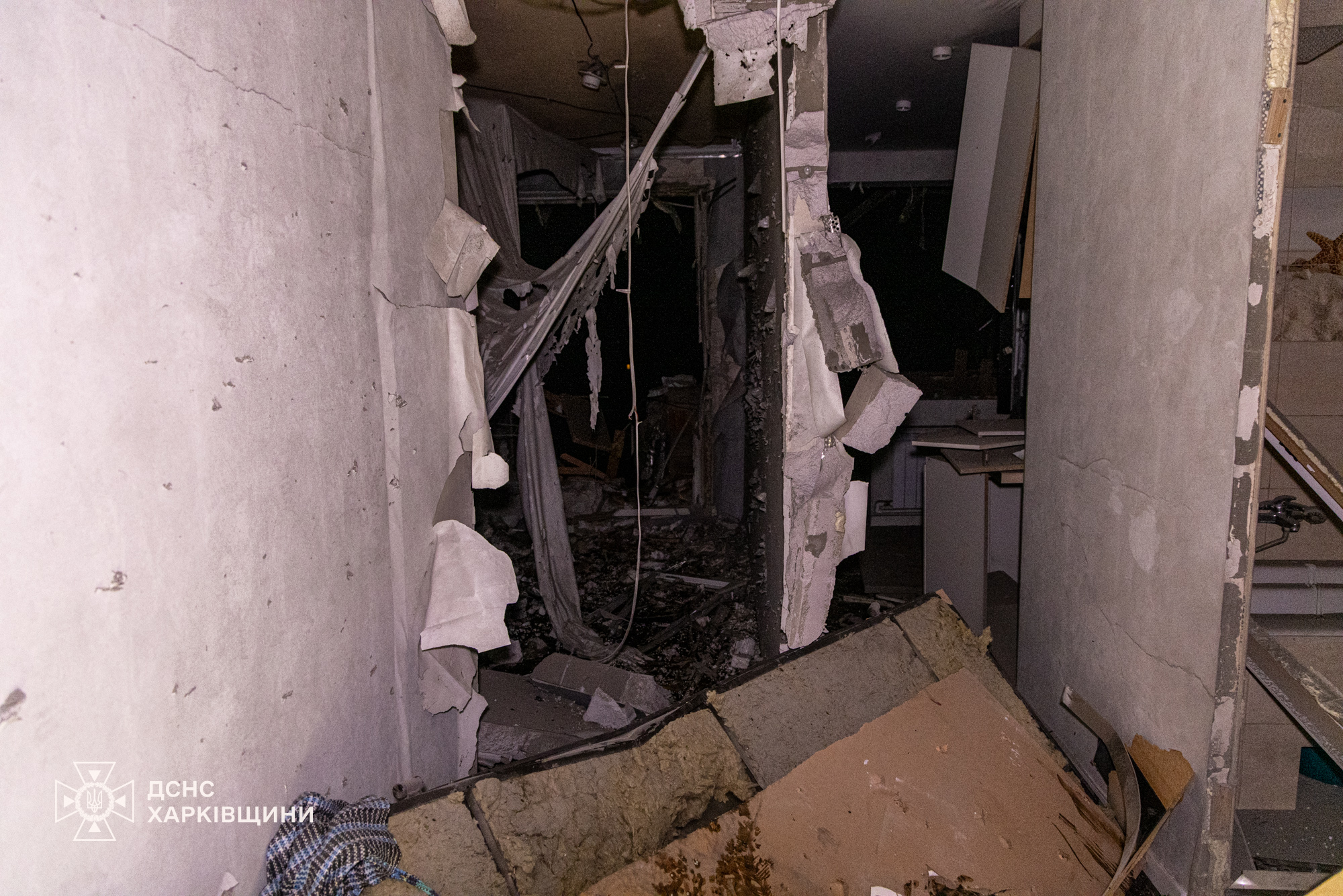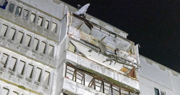 Внаслідок влучання частково зруйновані внутрішні конструкції та балкон квартири на верхньому поверсі.