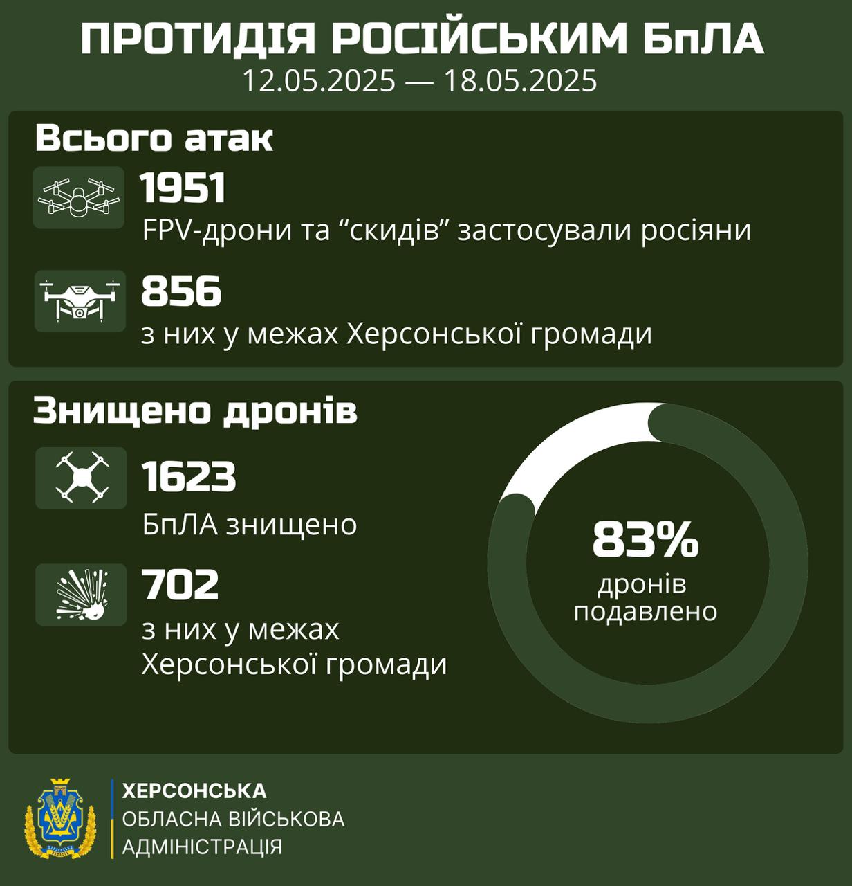 За наявними даними, за минулий тиждень російські війська запустили по громадам Херсонщини 1 950 дронів. Окупанти цілили по місцевих мешканцях та цивільній інфраструктурі.