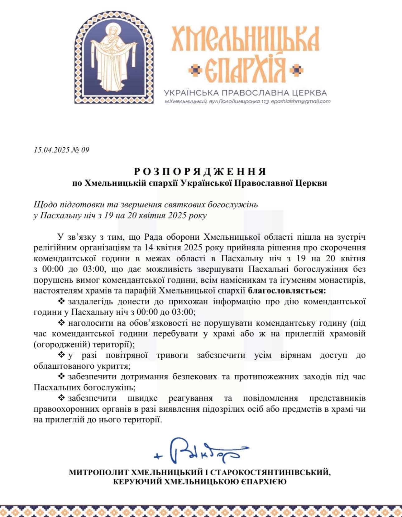 На Хмельниччині у Великодню ніч на дві години скоротили тривалість комендантської години