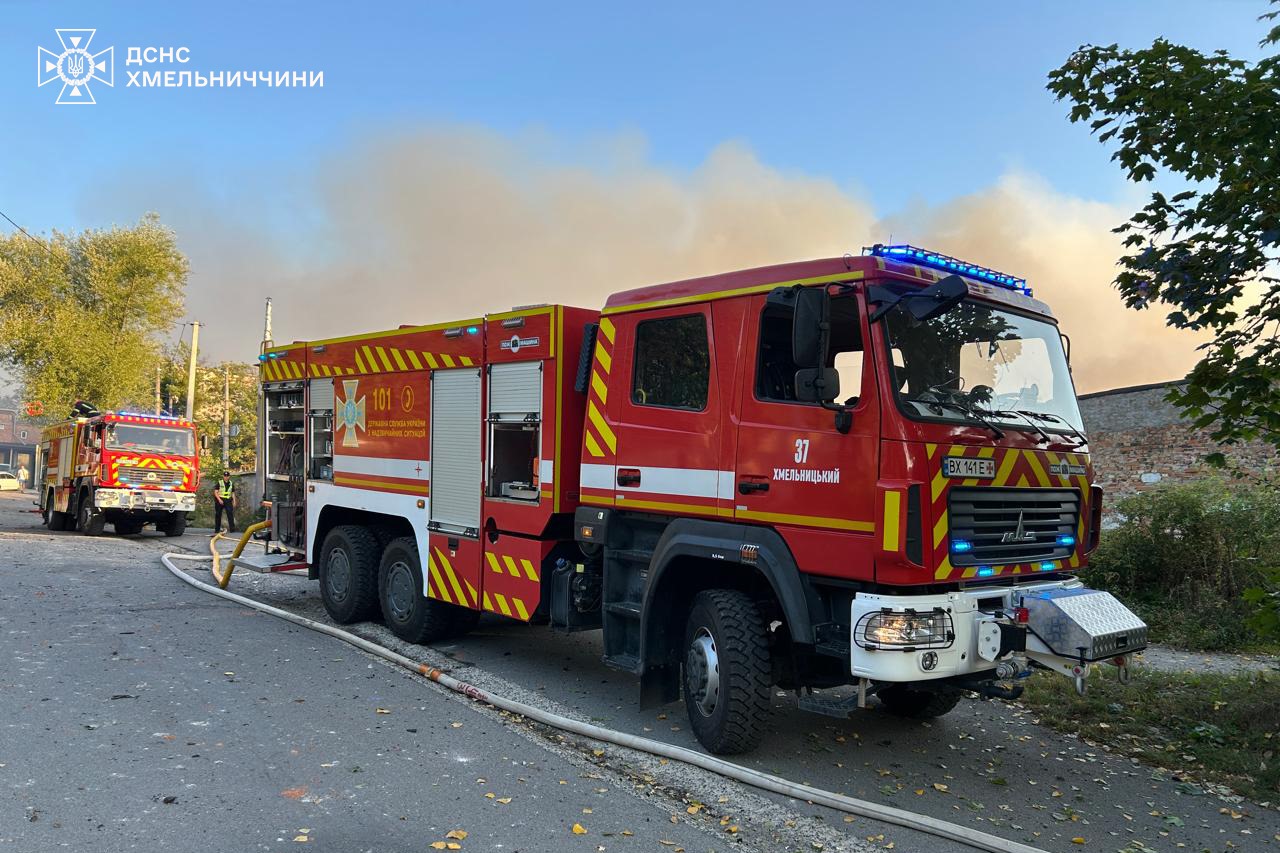 Хмельницька область зазнала подвійної атаки російських військ уночі та зранку. Для ударів було застосовано ракети й безпілотники, що спричинило масштабну пожежу на території гаражного комплексу