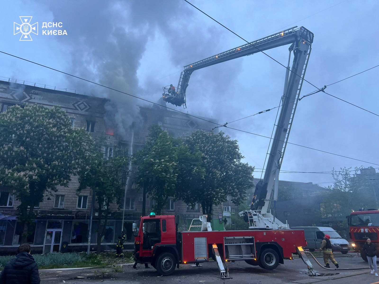 - Святошинський район: уламки БпЛА влучили у 9-поверховий житловий будинок. Сталося загоряння квартир на чотирьох поверхах — із 6-го по 9-й. Вогонь охопив близько 100 кв. м. Пожежу вдалося ліквідувати. Рятувальники евакуювали 5 осіб — 1 дорослого і 4 дітей.