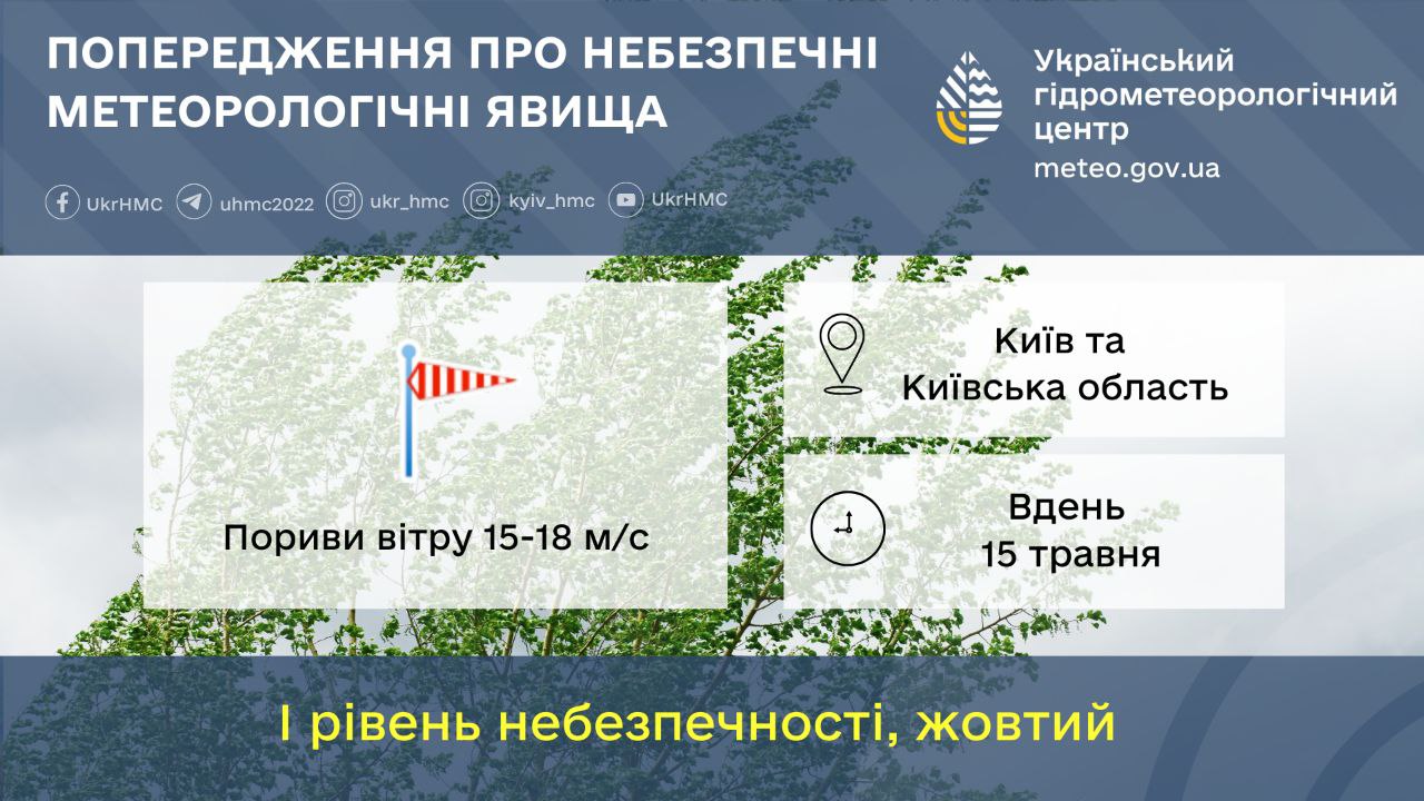 Сьогодні вдень, 15 травня, у столиці очікуються пориви вітру 15-18 м/с (I рівень небезпечності, жовтий)
