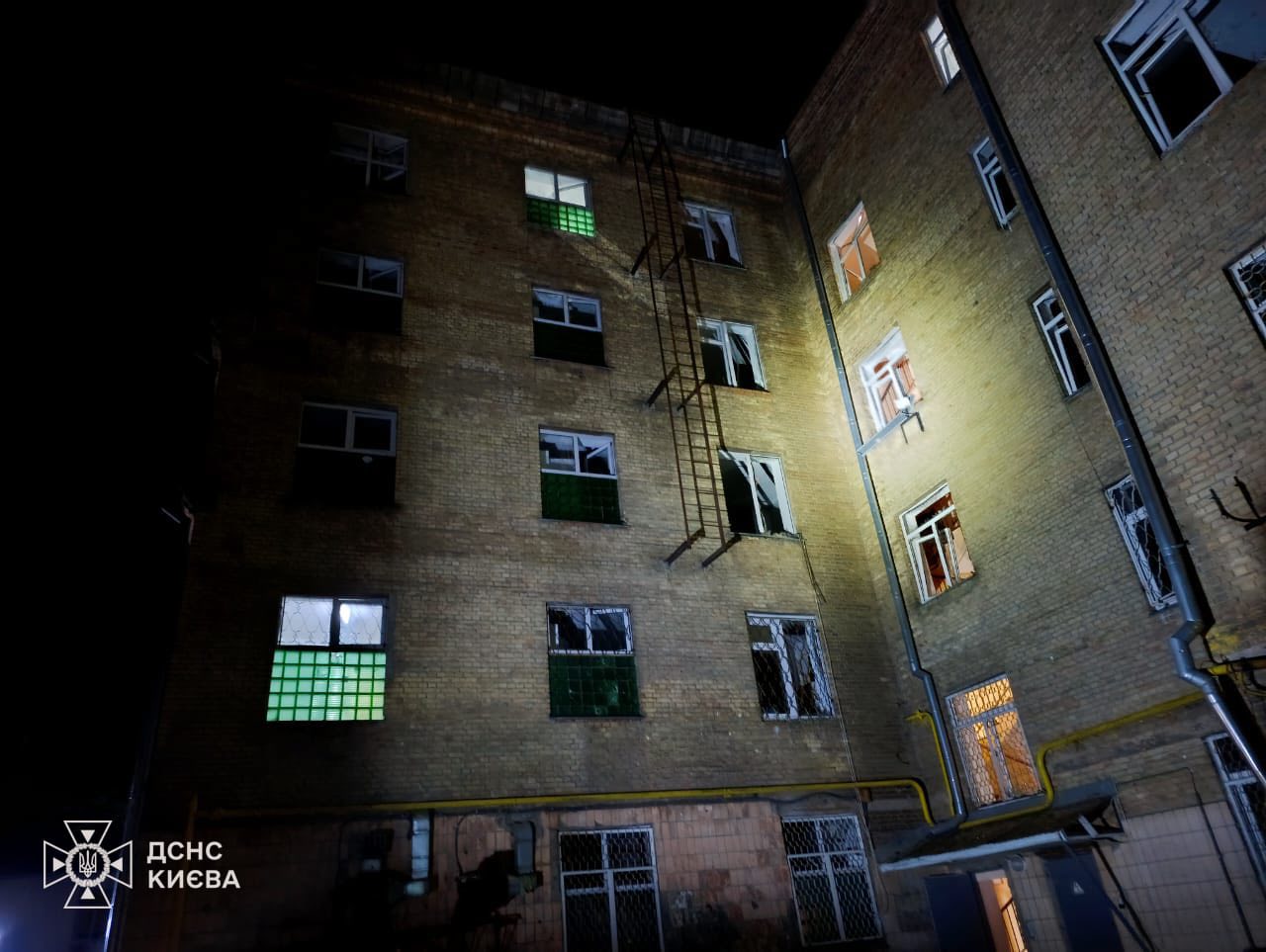 - Голосіївський район: уламки збитих ворожих БпЛА впали в кількох місцях.Виникла пожежа на фасаді 5-поверхового гуртожитку через розгерметизацію газової труби на 2-му поверсі. Частково зруйновані конструкції.