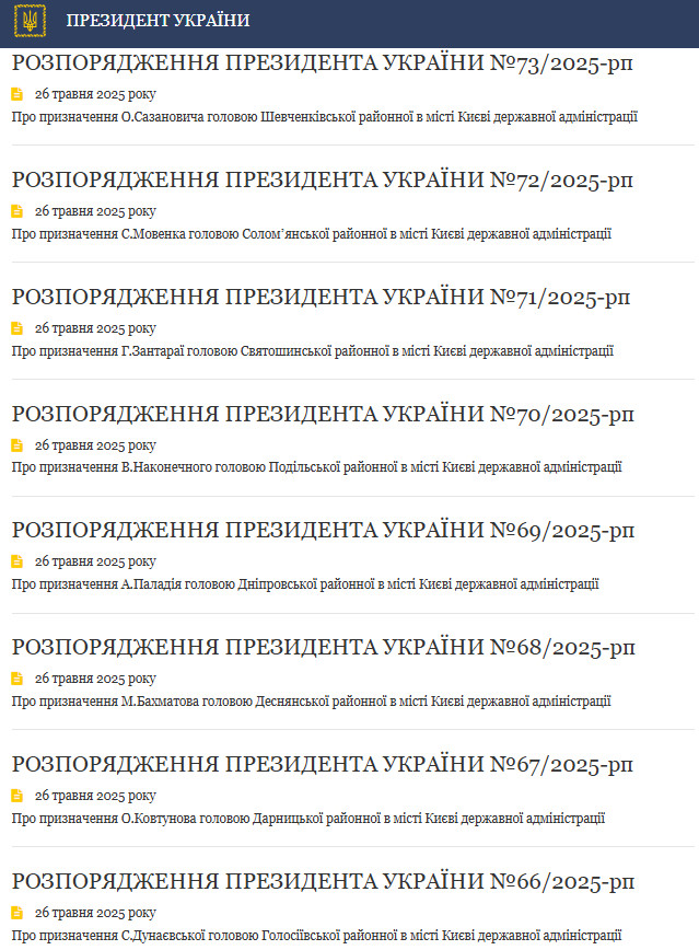 Президент України Володимир Зеленський призначив 8 нових голів районних державних адміністрацій Києва
