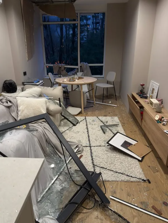 У квартирі розбиті вікна, телевізор зірваний зі стіни, а предмети інтер’єру розкидані або пошкоджені. Частина стелі обвалилася, на підлозі лежать уламки бетону, гіпсокартону та скла.