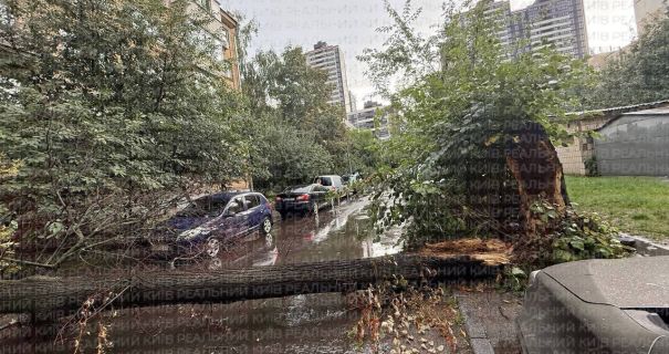 Протягом кількох годин Київ охопили злива, град та шквальний вітер. Деякі вулиці перетворилися на річки, а в громадському транспорті пасажири опинилися по пояс у воді. Через сильні пориви вітру в місті фіксують численні випадки падіння дерев, що становить небезпеку для пішоходів і автомобілів.