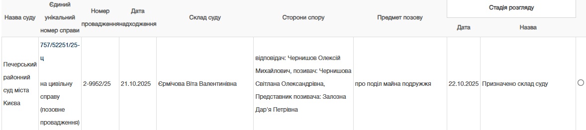 Позов у Печерському райсуді Києва подала його дружина Світлана Чернишова наприкінці жовтня. Справу розглядатиме суддя Віта Єрмічова, яка була переведена до столичного суду з Барського районного суду Вінницької області через високий обсяг справ.