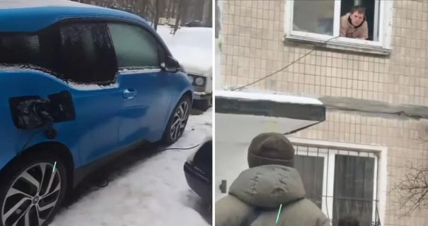 На відео видно синій електрокар, шнур зарядки якого тягнеться до вікна квартири на другому поверсі.