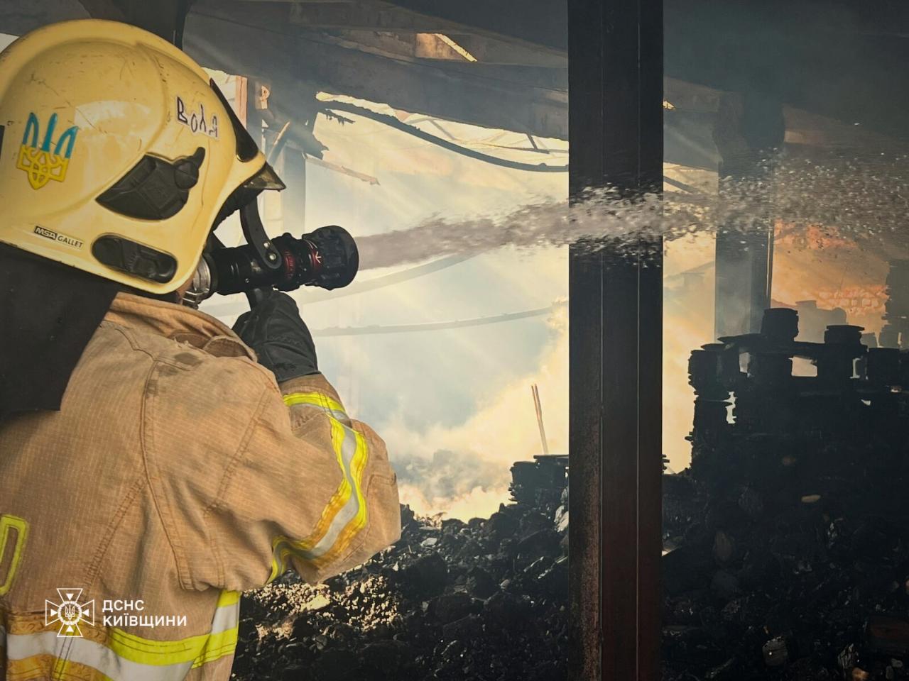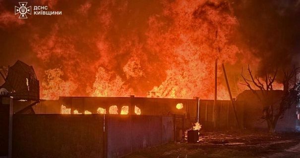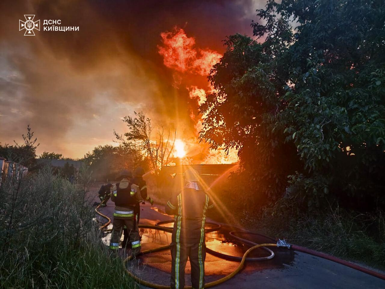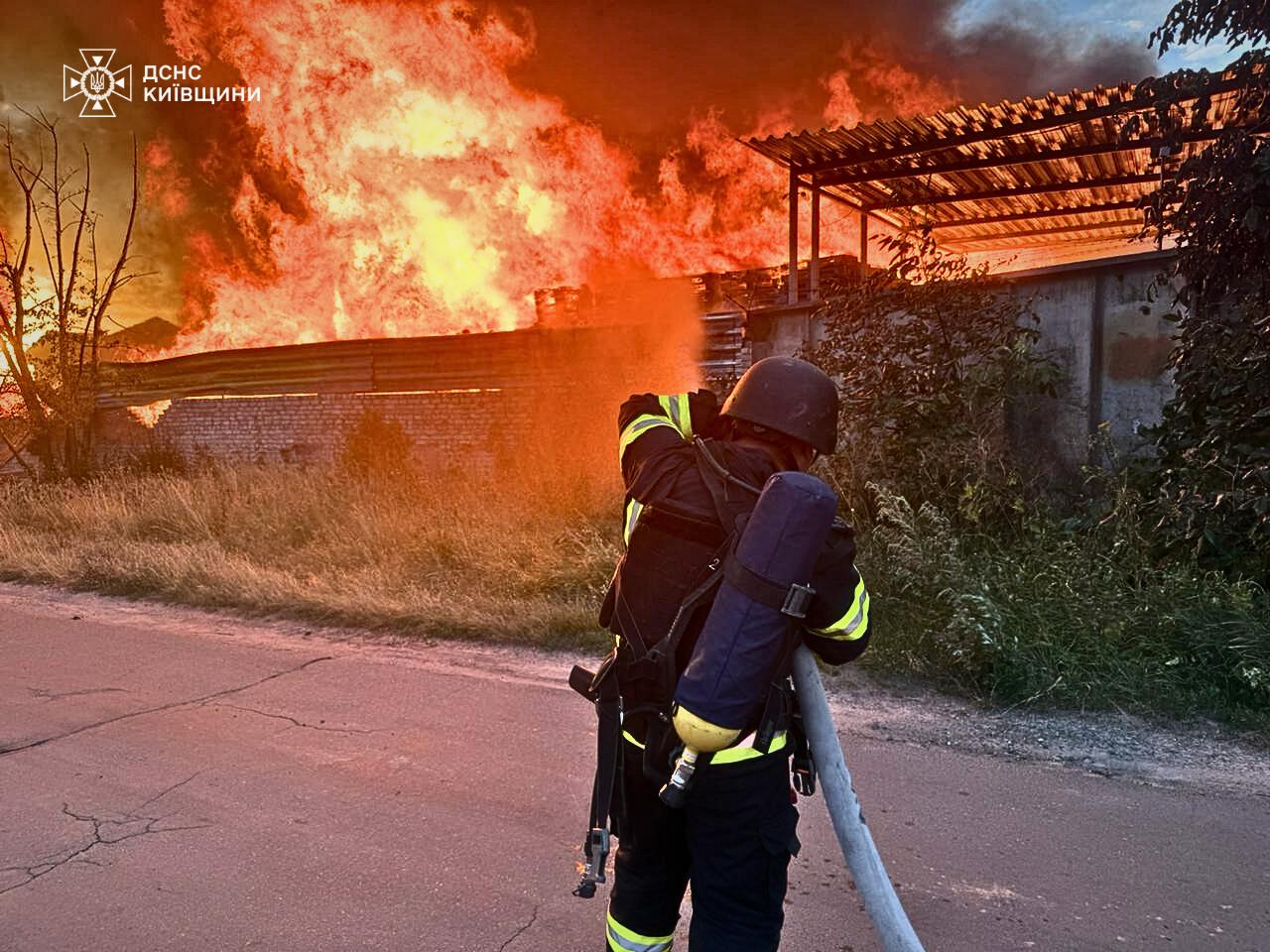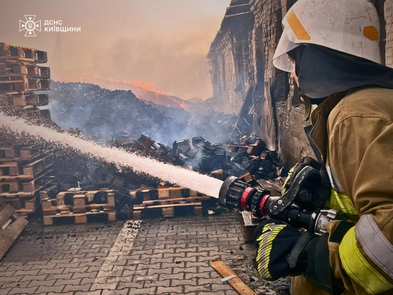 Масштабна пожежа на Київщині: через нічну атаку загорілося підприємство, постраждала жінка