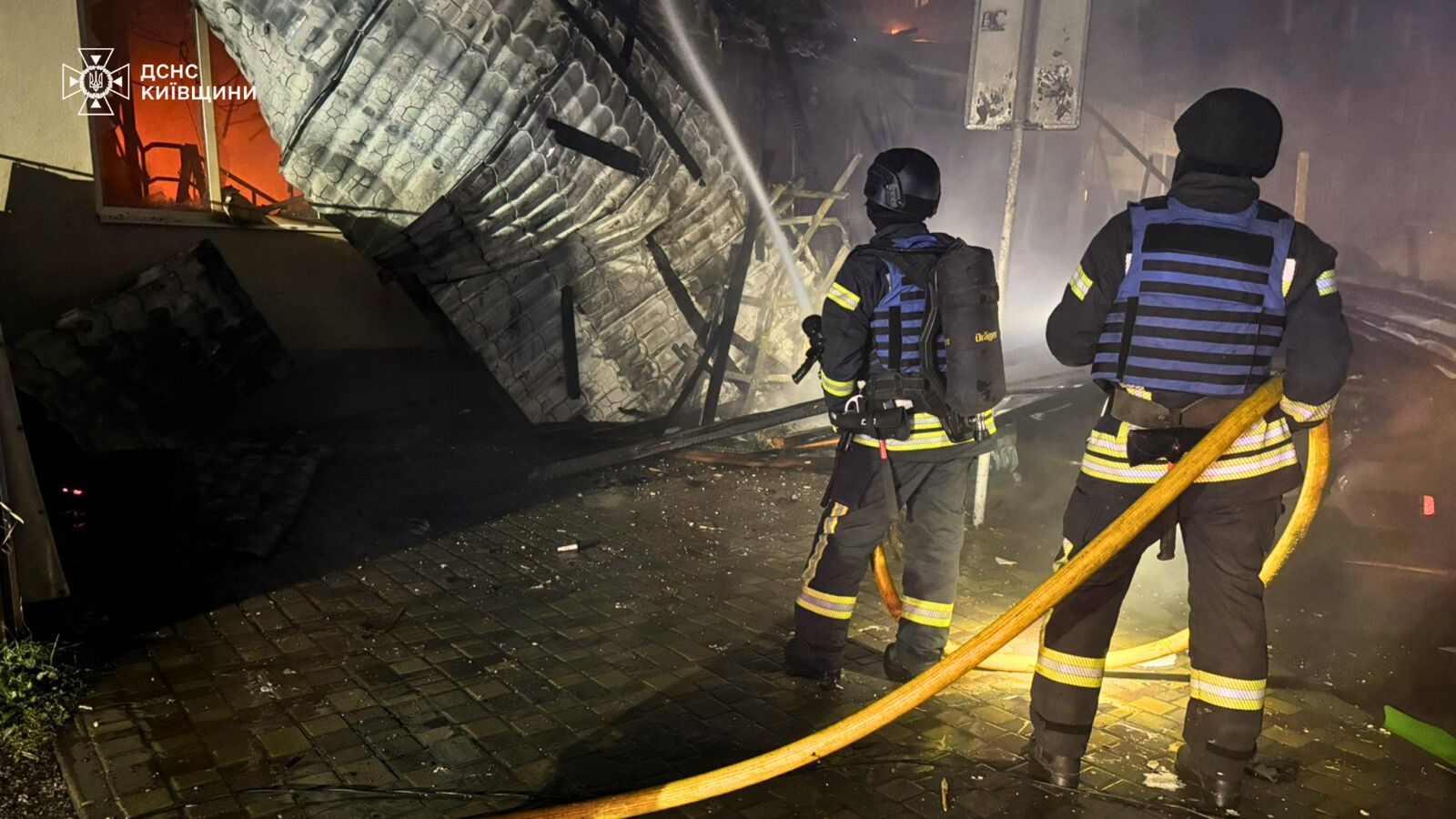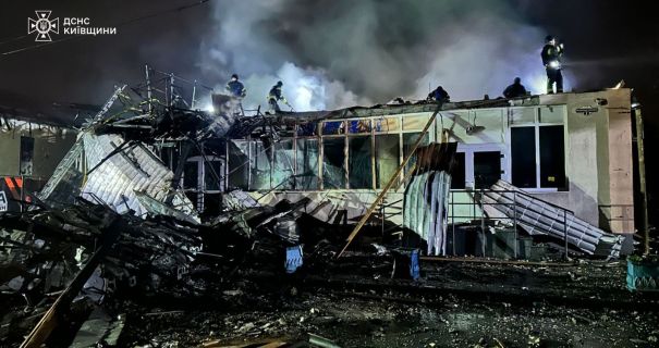Вночі у Броварах уламки ворожого безпілотника впали на двоповерхову будівлю мінімаркету, спричинивши пожежу та часткове руйнування споруди