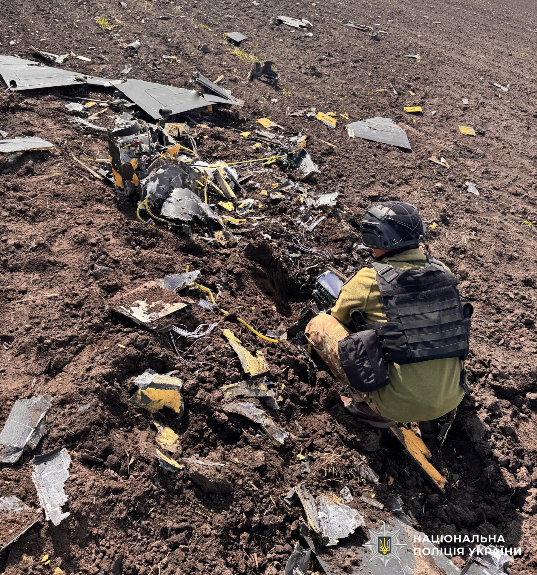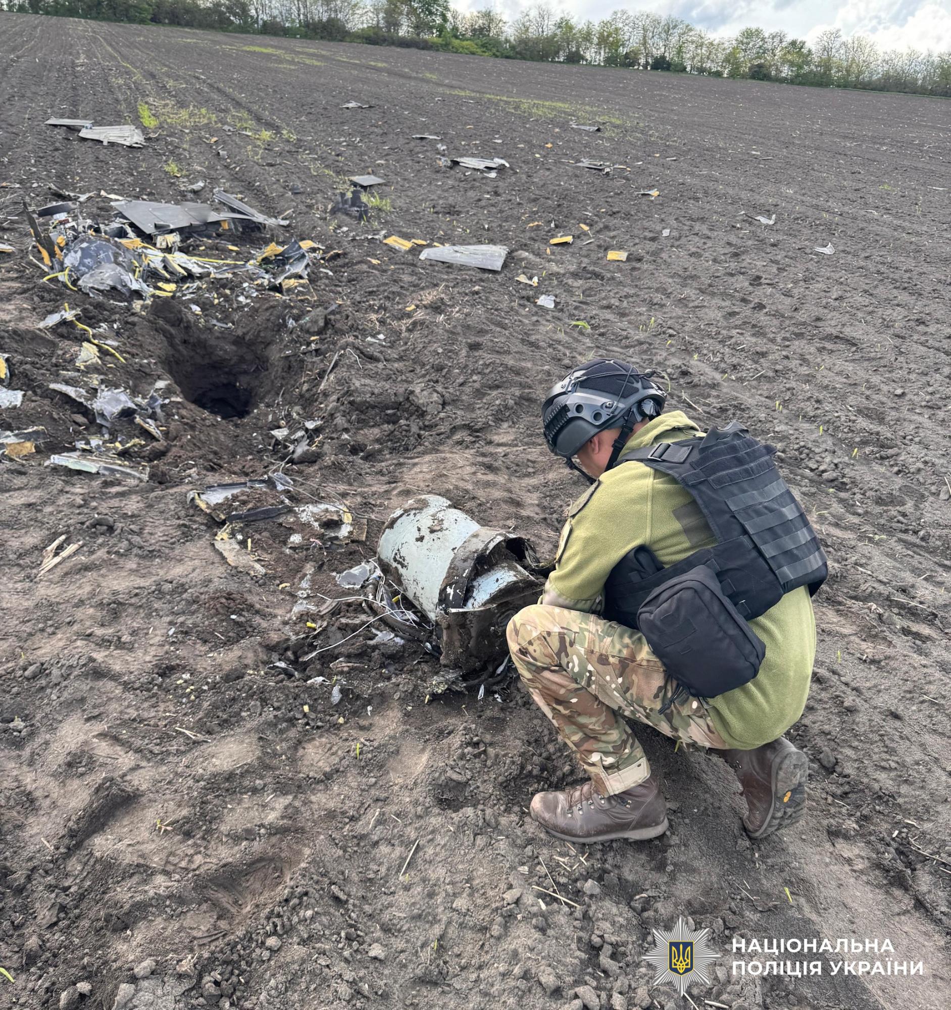 Зазначається, що бойова частина знайденого дрона вагою понад 50 кг не здетонувала й частково заглибилась у землю.