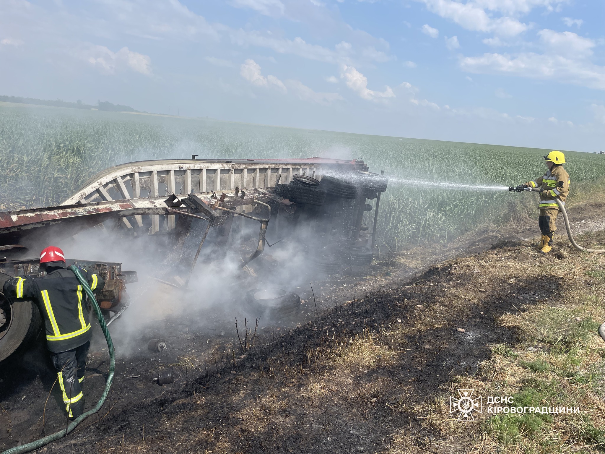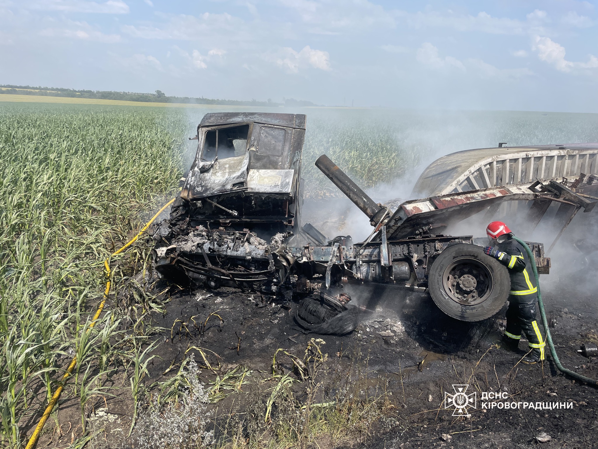 Виявилося, що близько 14:15 між селами П’ятихатки та Новопавлівка Новоукраїнського району внаслідок ДТП виникла пожежа вантажного автомобіля.