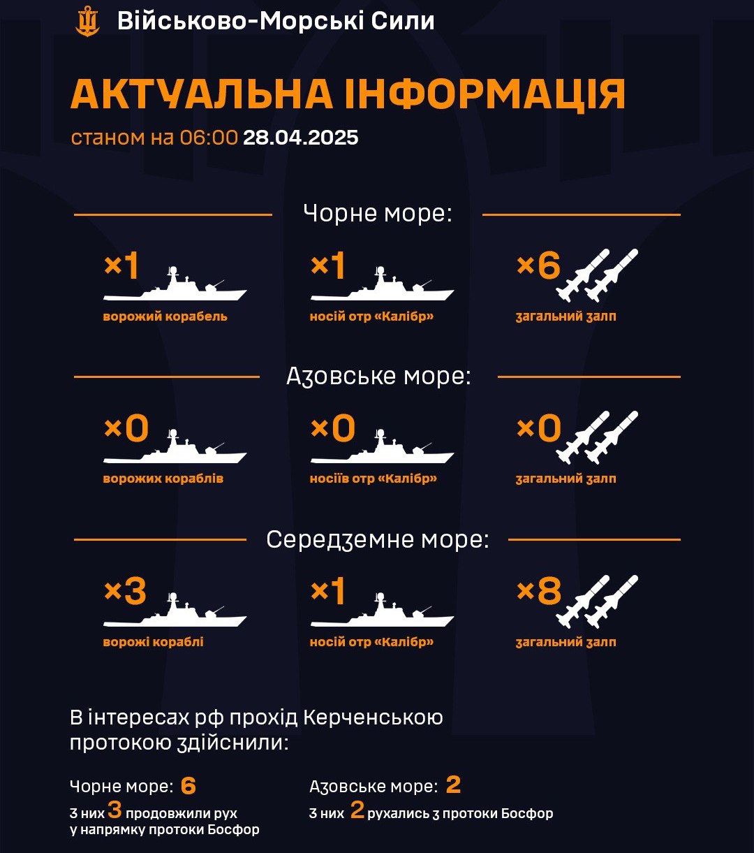 Станом на ранок понеділка, 28 квітня, російські війська вивели в акваторію Чорного моря один ворожий корабель, який є носієм крилатих ракет "Калібр". Загальний залп — до шести ракет