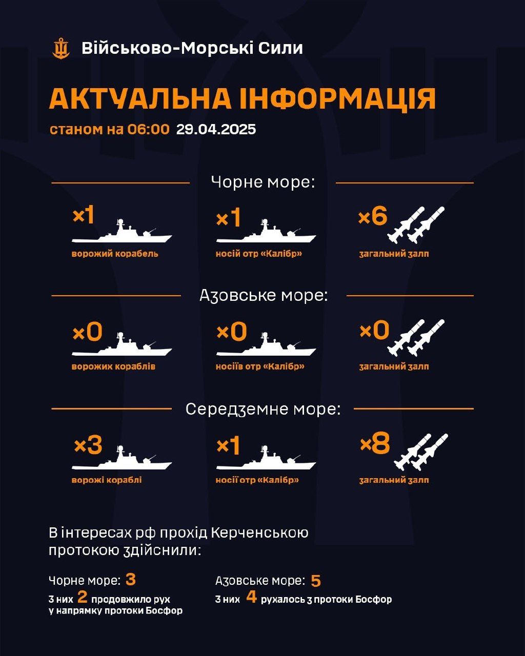 Станом на ранок 29 квітня РФ тримає в акваторії Чорного моря один корабель, який є носієм крилатих ракет "Калібр". Загальний залп – до 6 ракет